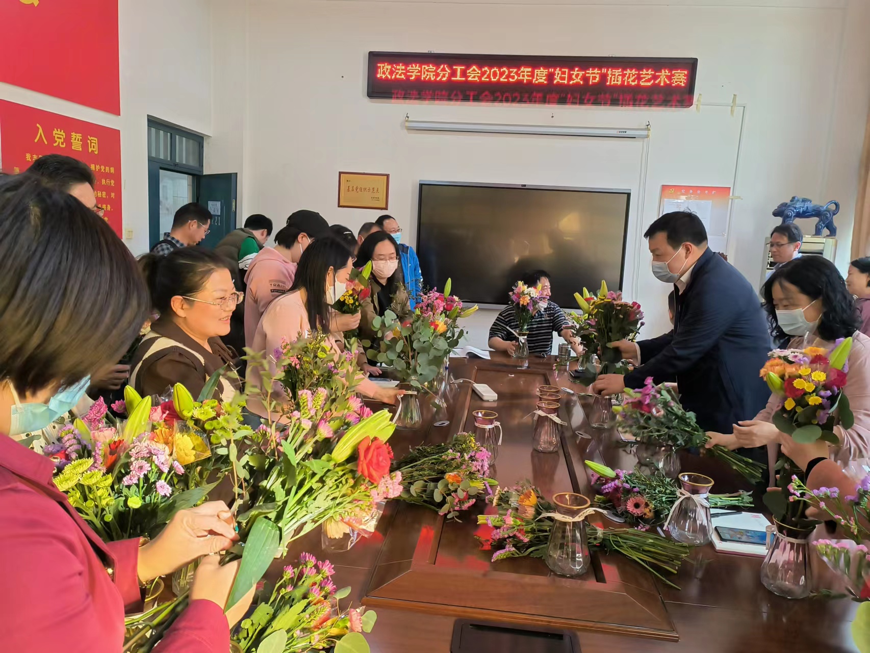 为构建和谐校园,陶冶教师情操,展示我院教职工美的一面,借用花木来抒发教师们的高雅情怀,以花感人,以花育人,3月8日下午,我院分工会在1221会议室举办了2023年度“妇女节”插花艺术赛,由政太阳集团网站8722党委书记、关工委主任王刘涛主持,全体分工会会员参与了此次活动。