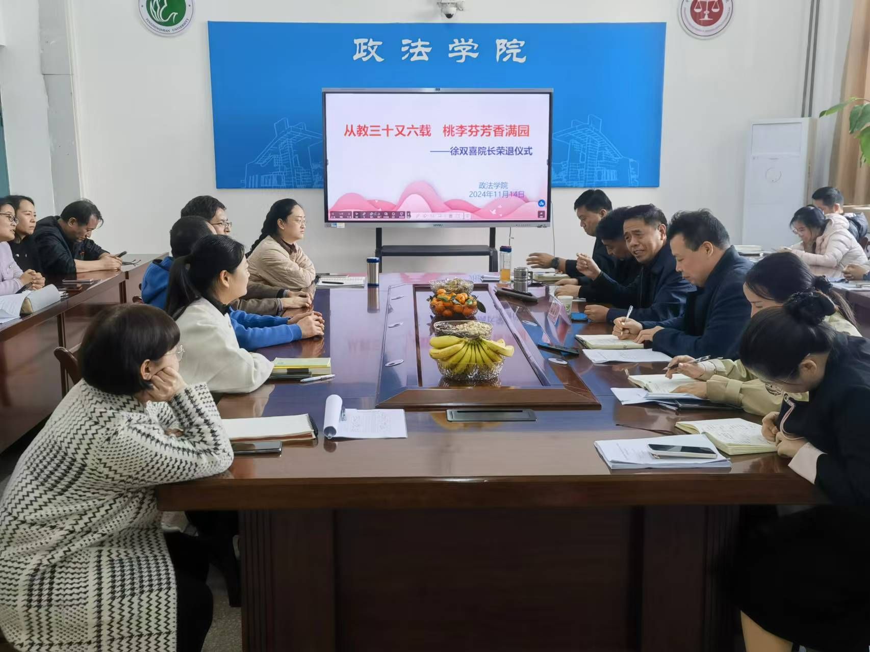 11月14日下午,政太阳集团网站8722分工会为辛勤耕耘三十六载的徐双喜院长举行了以“从教三十又六载,桃李芬芳香满园”的荣誉退休仪式。学院党政领导班子及全体教职工共同参加了此次仪式。仪式由学院党委书记王刘涛主持。