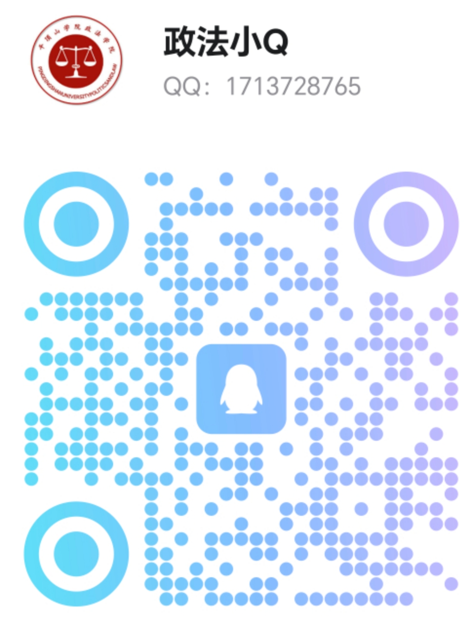 此外,我们还开通了多重咨询渠道:可添加QQ联络专员(政法小Q:1713728765) 一对一咨询,获取个性化报考建议;关注学院微信公众号,实时接收招生政策解读、校园动态及录取资讯;拨打招生咨询电话(0375-2077208) ,直接与招生工作人员沟通,全方位为考生科学报考提供支持。