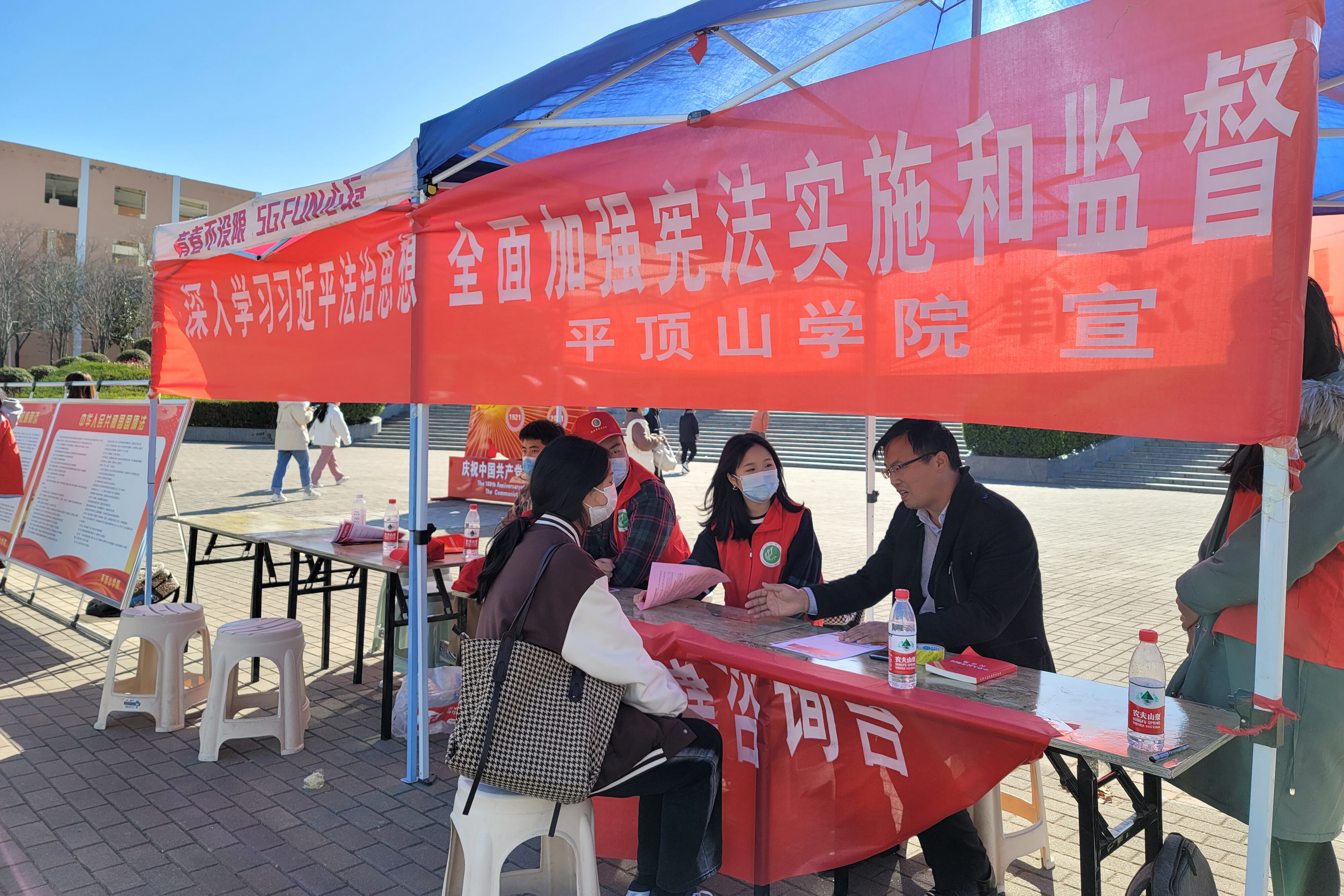 12月3日清晨,我院师生参加升旗仪式及诵读《中华人民共和国宪法》活动,在线观看了教育部举行的第八届国家宪法日“宪法晨读”网络直播活动。我院师生代表在扇形广场通过制作活动展板、发放法律知识传单、开设法律咨询台等方式普及法律知识,弘扬宪法精神,切实提升师生学法、知法、懂法、用法的能力和水平。