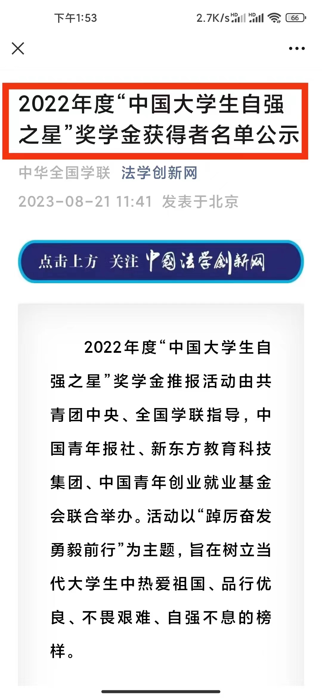 近日,由共青团中央、全国学联指导,中国青年报社、新东方教育科技集团、中国青年创业就业基金会联合举办的2022年度“中国大学生自强之星”奖学金评选结果揭晓。我院20法学二班高雪茹同学成功入选,荣获“中国大学生自强之星”奖学金荣誉称号。