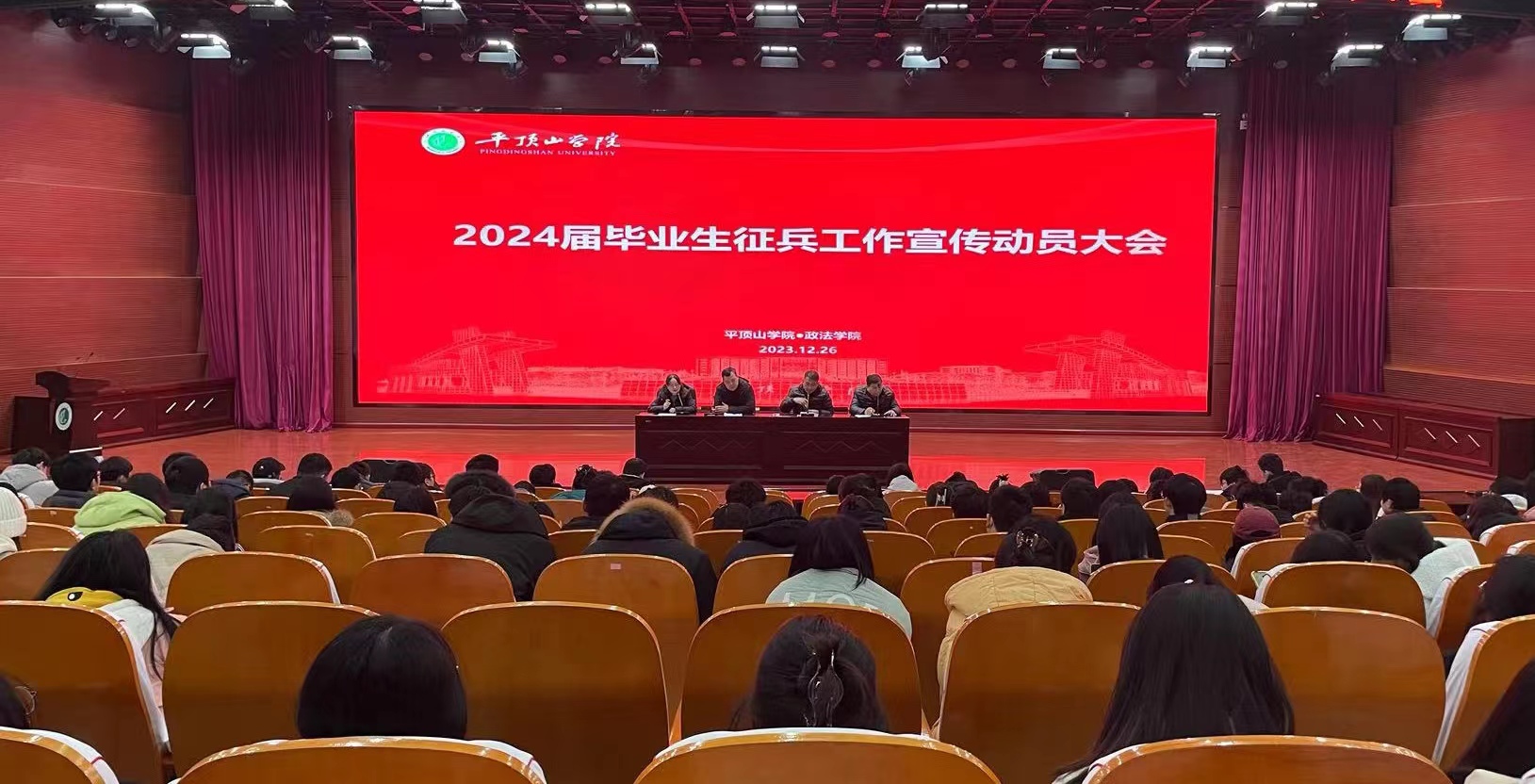 为积极响应党和国家号召,鼓励青年大学生积极参与应征入伍,献身国防。2023年12月26日在中心会议室召开2024届毕业生征兵工作宣传动员大会。政太阳集团网站8722党委书记王刘涛、院长张晓东、副院长马君昭、党委副书记祁坤、毕业班辅导员赵明跃及2024届191名毕业生参加会议。征兵工作宣传动员会议由政太阳集团网站8722祁坤主持。