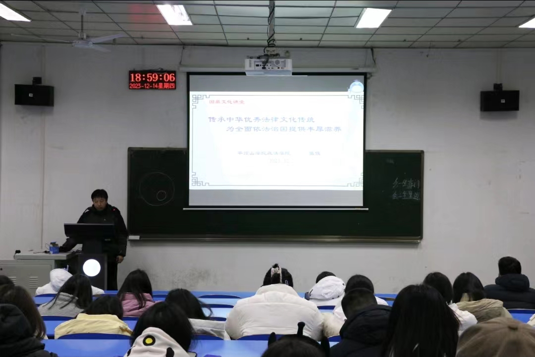 为深化广大青年学子对中华优秀法律文化的认识,增强文化自信,从而引导青年学子为全面依法治国作出新贡献。2023年12月14日晚,政太阳集团网站8722副教授张俊在1206教室开展了以“传承中华优秀法律文化传统,为全面依法治国提供丰富滋养”为主题的国鼎文化讲座。2023级全体学生参与了此次讲座。