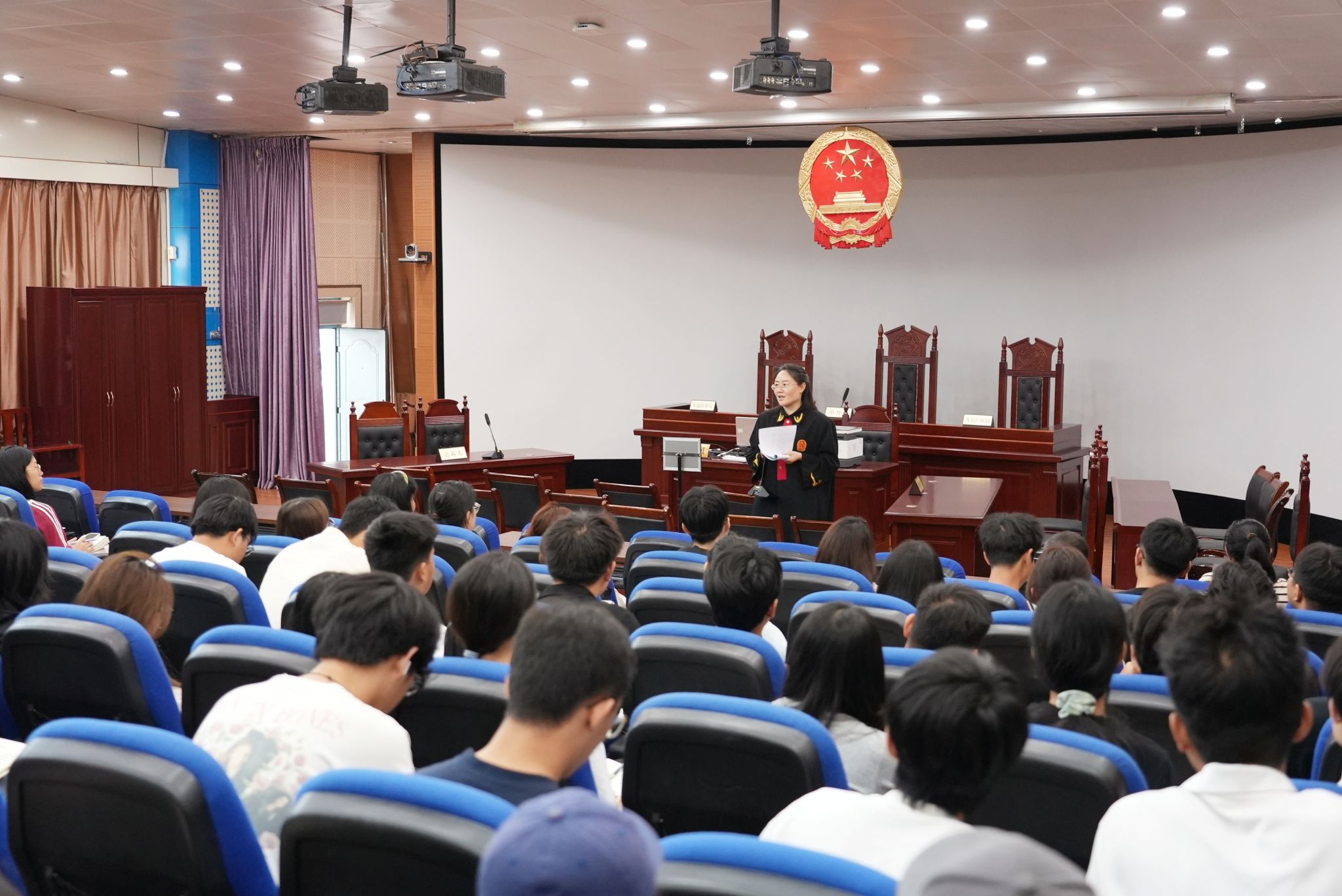 开庭前,刑事审判庭闫筱玉庭长向同学们介绍了案件概况与刑事审判庭审流程,让同学们提前了解案件的审判要点和庭审的基本规范。