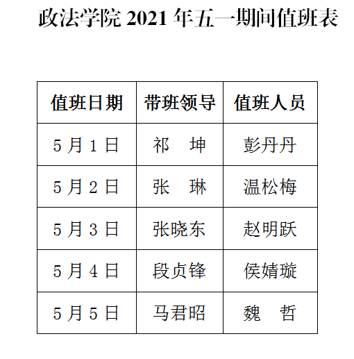 一、2021年5月1日(周六)至5月5日(周三)放假,放假期间教学活动暂停。4月25日(周日)、5月8日(周六)按既定课表开展教学活动。因放假导致课时不足的课程,由授课教师自行安排时间补课,并按程序报备。