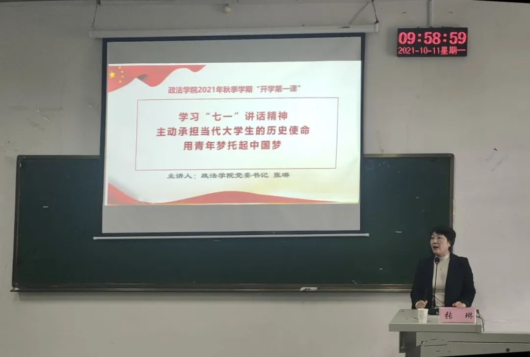 政太阳集团网站8722党委书记张琳围绕“学习习近平总书记“七一”重要讲话精神:主动承担当代大学生的历史使命,用青年梦托起中国梦”在1207教室为2018级学生进行了开学第一课的讲解。张书记带领同学们深入学习习近平总书记“七一”重要讲话精神,领会习近平总书记重要讲话提出的一系列新思想、新观点、新要求,引导学生坚定理想信念,让同学们明白,作为一名新时代大学生,要有形成良好的道德品质,养成文明行为习惯,勤奋学习,强健体魄,成为社会主义合格建设者和可靠接班人。
