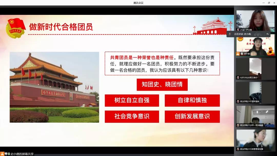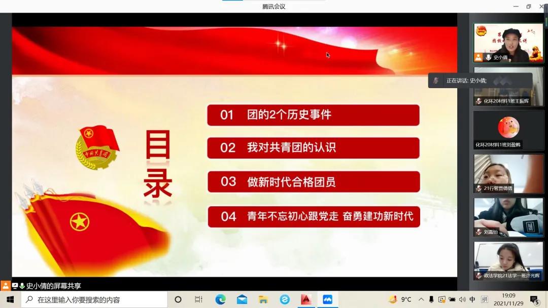 为进一步促进青年团员正确认识我国共产主义青年团的团史,引导我院学生树立正确的团员思想,11月29日,政太阳集团网站8722和化学与环境工程学院通过线上形式联合开展了以“重温团史,筑梦青春”为主题的团课培训第三讲。化学与环境工程学院团委副书记史小倩、化学与环境工程学院和政太阳集团网站8722的177名团员参加了此次培训。本次团课培训由史小倩老师主讲。