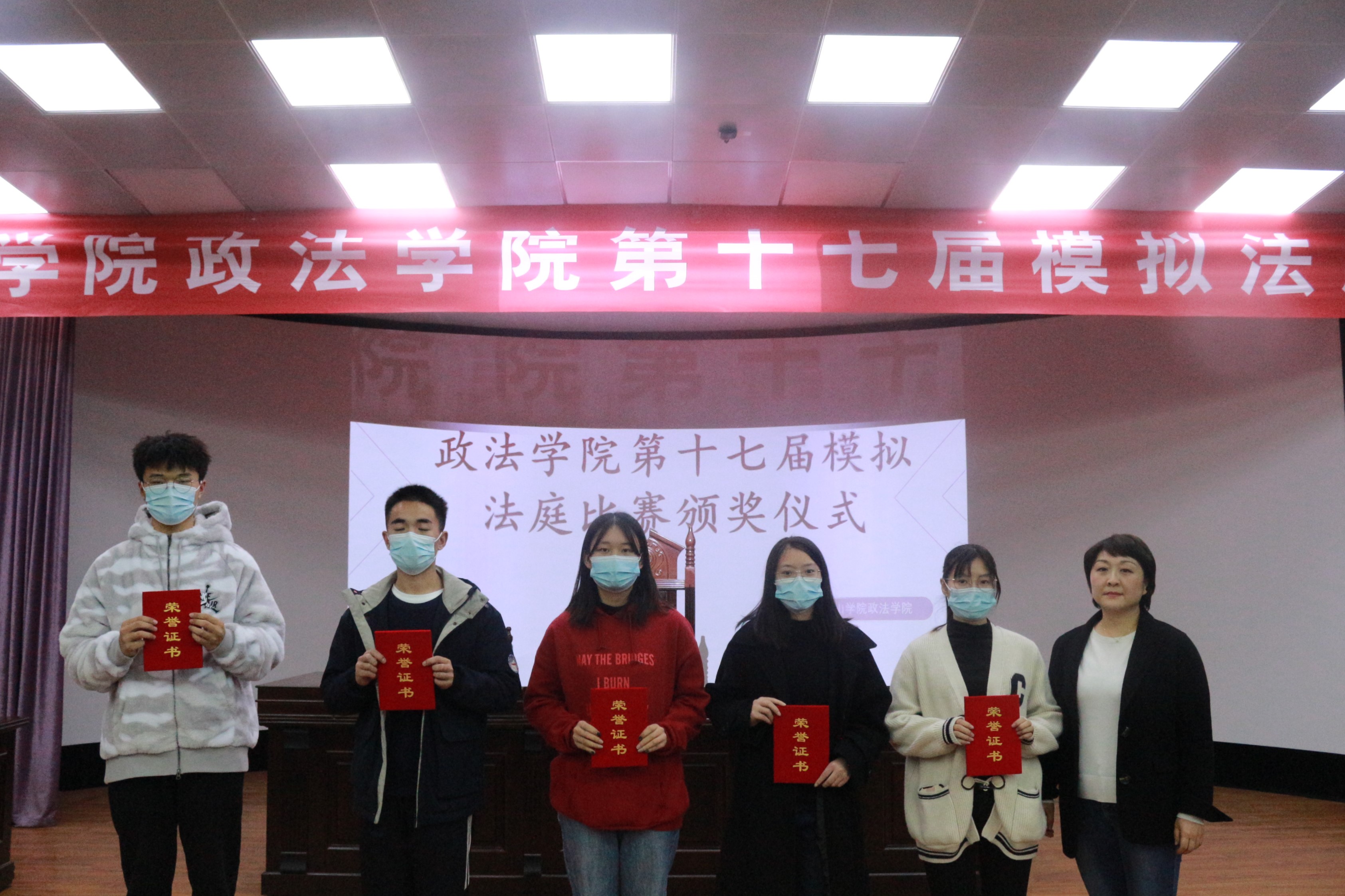 随后,段院长对活动进行总结,他对积极参与本次模拟法庭的同学们表示肯定与赞赏,同时指出同学们辩论时应该充满信心,有辩论的气势,展现出自己的能力。最后,张琳书记为获奖团队颁发荣誉证书。至此,本次模拟法庭比赛圆满结束。