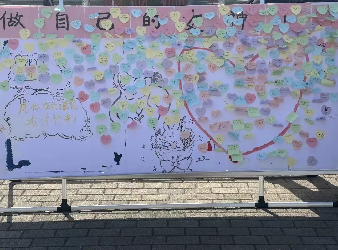 活动现场还布置了一个贴满关于对女性刻板印象标签的展板,参与活动的学生可撕下这些被定义的标签,并写上对女同胞们祝福的话语。现场同学们积极参与,一张又一张贴有刻板印象的标签被撕下,取而代之的是一句又一句温暖人心的美好祝福。