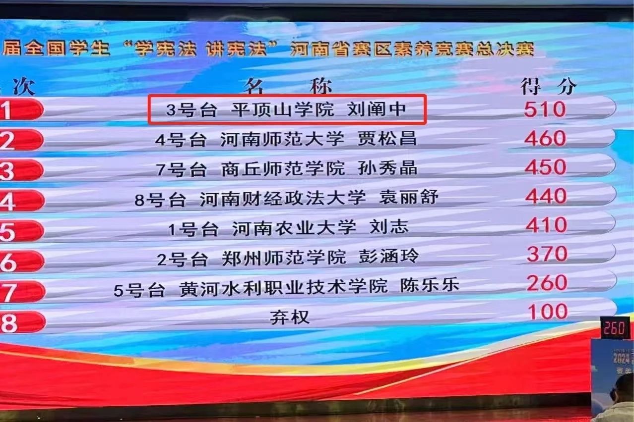 此次“学宪法 讲宪法”比赛竞争激烈。刘阐中赛前积极准备,全力以赴,深入研读宪法条文,精心打磨演讲内容,刻苦训练演讲技巧。历经校赛、省赛、国赛,一路过关斩将,最终取得国赛二等奖的好成绩,充分展示了我校学生昂扬向上、勇于挑战的良好精神风貌,生动诠释了新时代政太阳集团网站8722学子对宪法的尊崇与知行合一精神。
