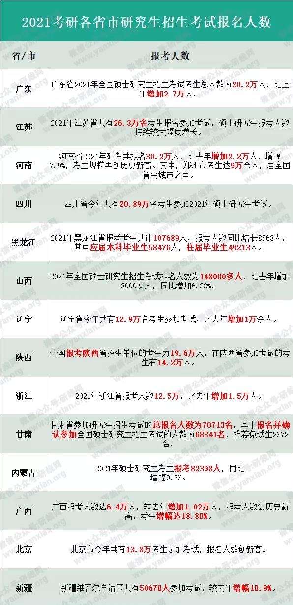 目前共有14个省市公布了2021考研初试报考人数,总人数排名前三的是:河南、江苏、四川,其相较于2020年也有大幅度增长。