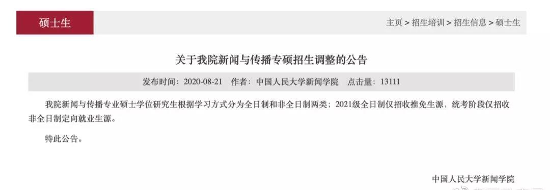 中国人民大学官网发布了新闻学院新闻与传播专业硕士招生调整的公告,2021级全日制仅招收推免生源,统考阶段仅招收非全日制定向就业生源。