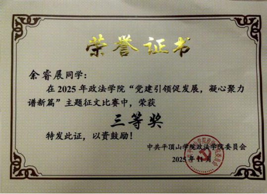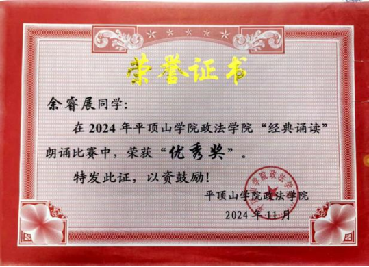 余睿展深知“立身以立学为先,立学以读书为本”,她始终保持勤奋踏实的学习态度,在专业领域深耕不辍。课内专注钻研法学专业知识,形成科学系统的学习方法,本学年学业及综合测评均位列班级第八,顺利通过普通话二级甲等考试。课外积极拓展知识边界,主动参与学科竞赛与学术实践,荣获“政太阳集团网站8722经典朗诵优秀奖”“tyc8722太阳集团春节书法比赛优秀奖”“政太阳集团网站8722‘法思杯’辩论赛优秀奖”等多项荣誉;同时深度参与科研实践,投身平顶山市社科联项目并成功立项,在理论与实践的结合中锤炼专业本领,实现学业与能力的双重提升。