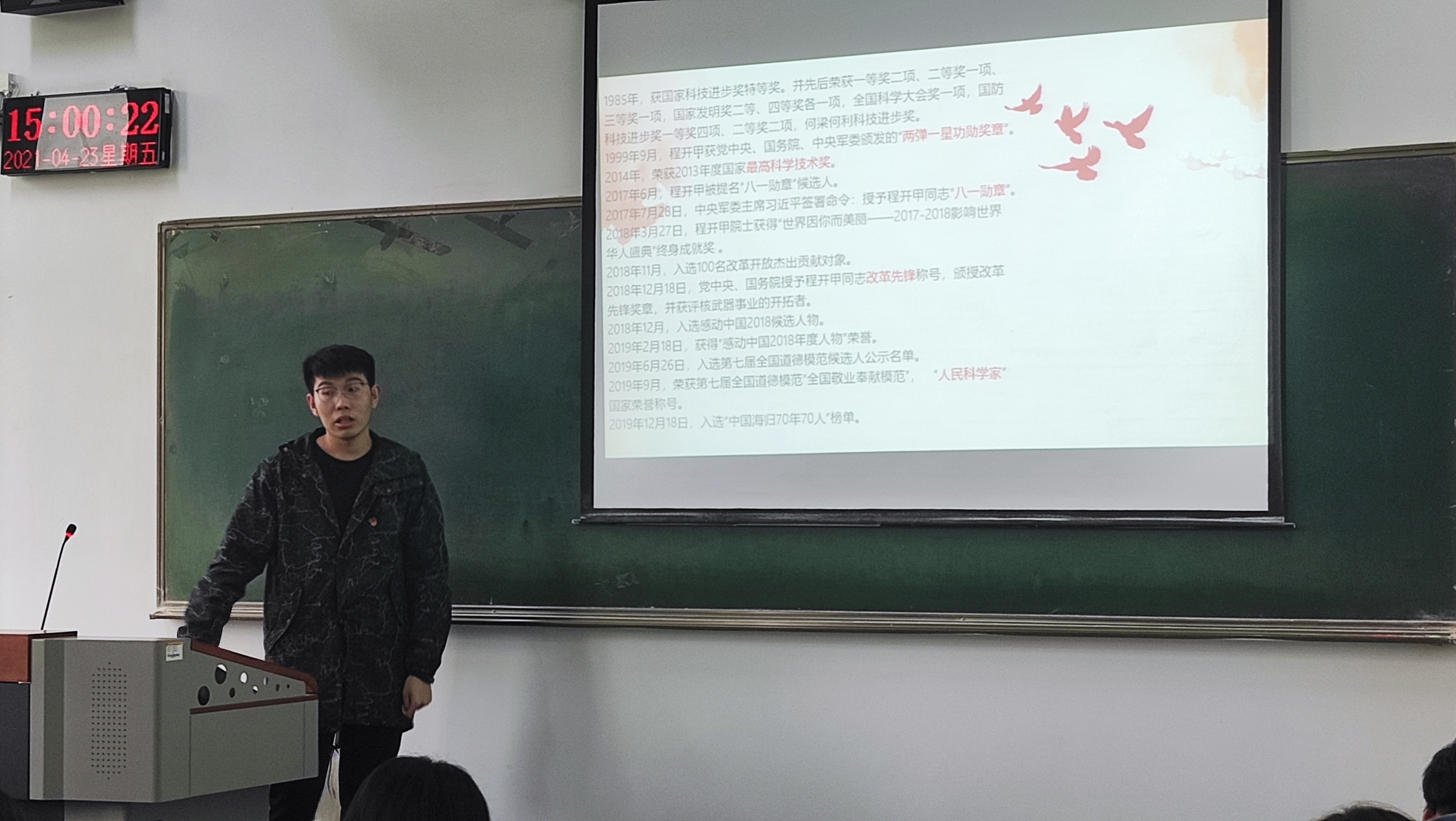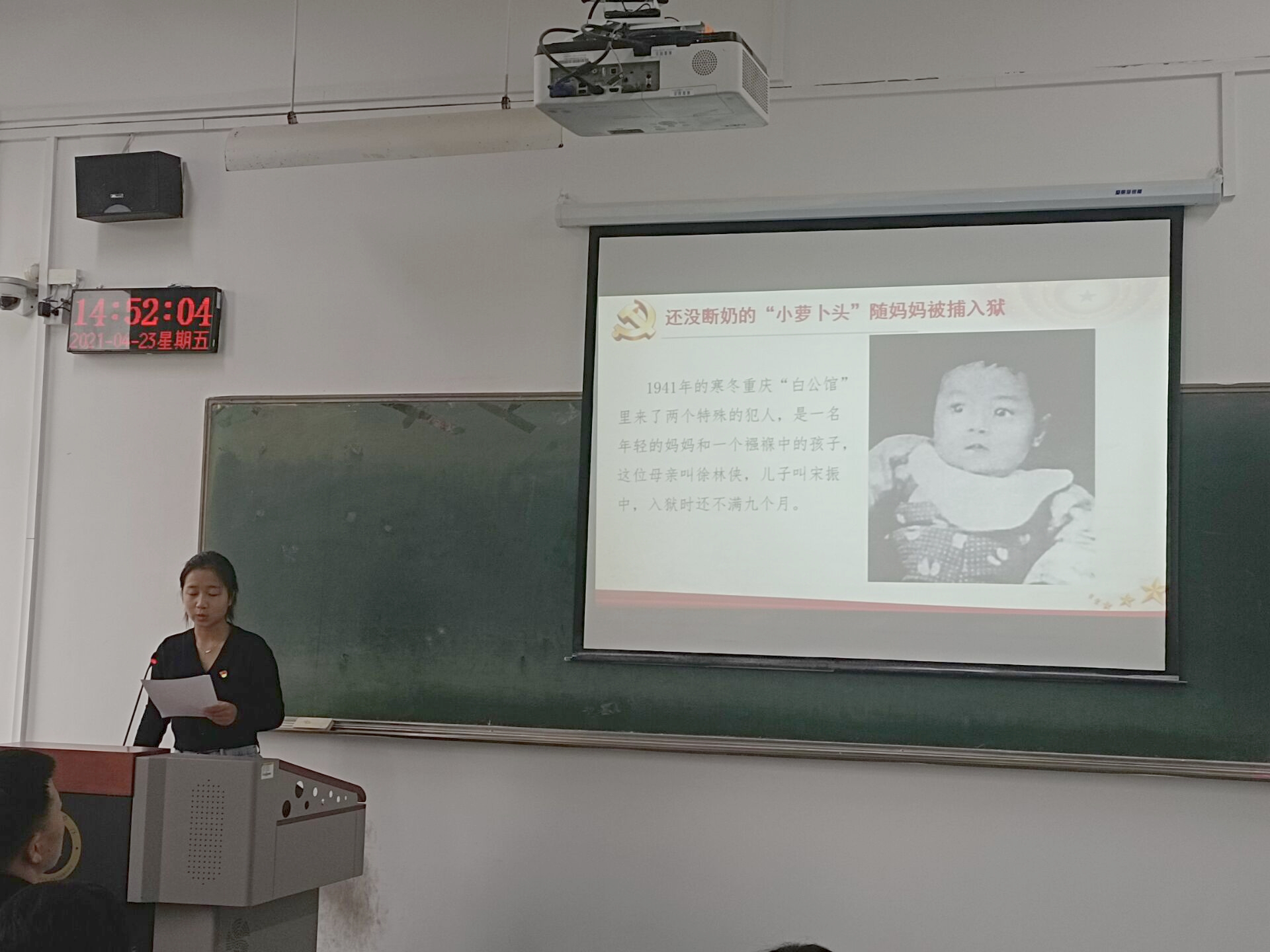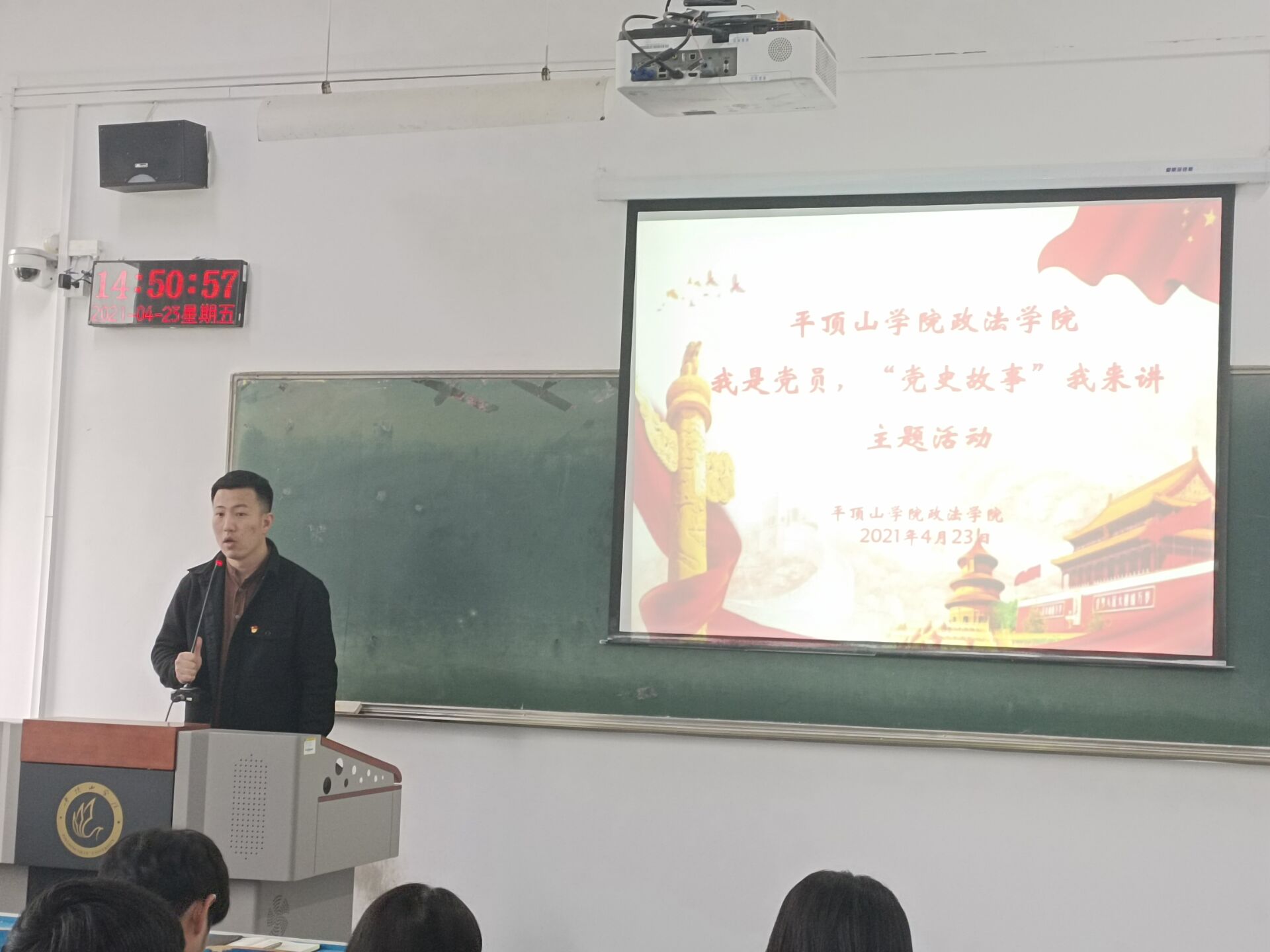 在启动仪式上,学生第一党支部书记马延明老师首先就开展党史学习教育的目的和意义进行了阐述,并对开展“我是党员,党史故事我来讲”系列活动做了明确的要求。马老师讲话中指出,作为与祖国一同成长的青年大学生,尤其是作为青年学生党员,要时刻牢记自己的入党初心和使命,按照习近平总书记学史明理、学史增信、学史崇德、学史力行的要求,不断提升理论水平,练就为人民服务的本领,以优异成绩迎接党的百年华诞。紧接着,18法学一班学生党员艾刘杰和王潇分别以《程开甲将军的一生》、《宋振中--最小的共产党员》为题进行了党史故事的讲解。