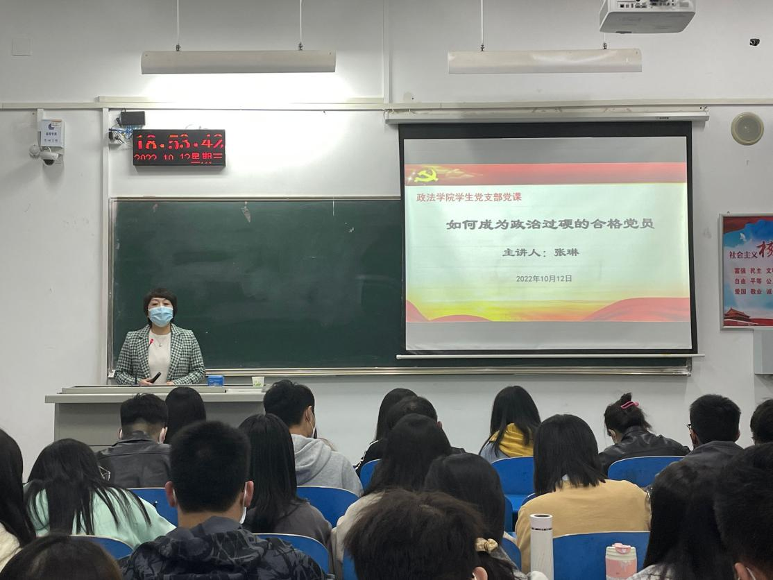 为深入学习贯彻习近平新时代中国特色社会主义思想,全面加强基层党组织建设,锻造党员过硬的能力和作风,10 月 12 日晚,政太阳集团网站8722党委书记、关工委主任张琳以“如何成为政治过硬的合格党员”为主题 ,在1214教室为全体学生党员上了一节生动党课。