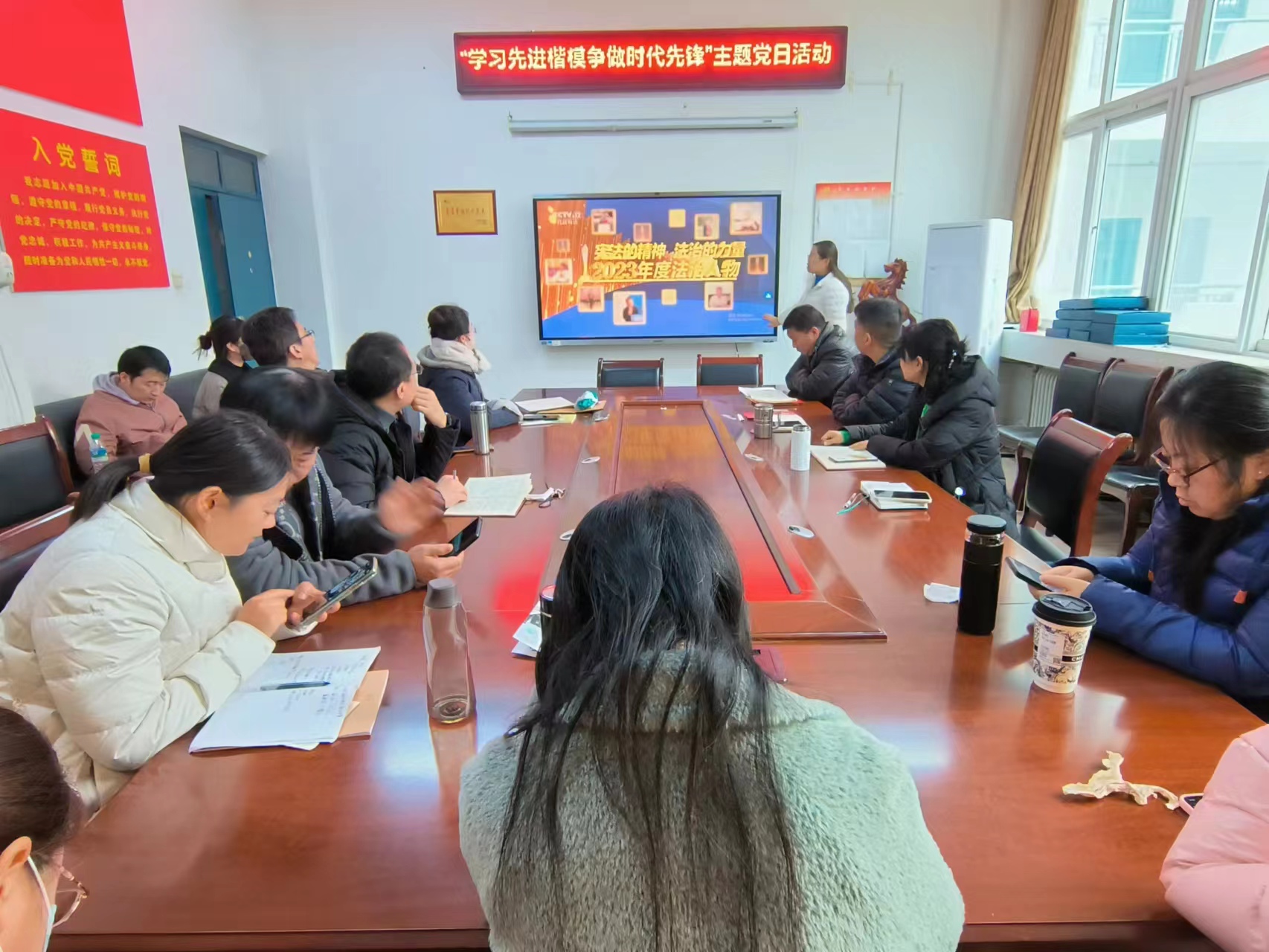 最后,党员同志们通过与刚刚荣退的老党员马雪芹教授交流谈心,切身感受了身边的楷模事迹,通过观看《宪法的精神 法治的力量——2023年度法治人物》专题片,认真聆听了在法治战线上坚守和付出的感人故事。