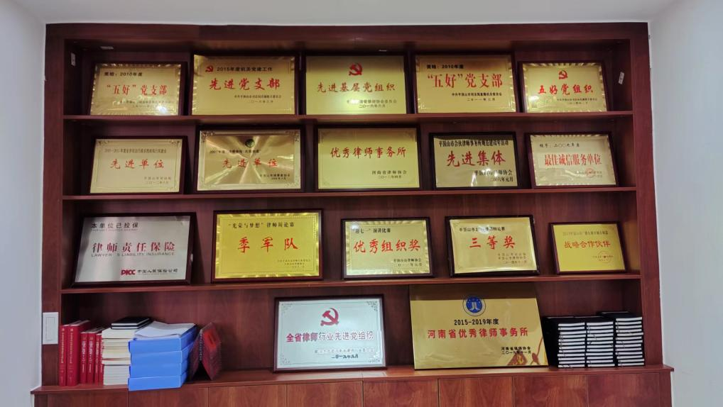 大乘律师事务所于2006年1月被平顶山市律师协会评为先进集体;2008年被平顶山市消费者协会评为“2007年度消费维权 共筑和谐”先进单位;2010年3月被平顶山市消费者协会授予“2009年度最佳诚信服务单位”;2011年3月被中共平顶山市司法局直属机关委员会评为“五好党支部”;2012年4月被河南省律师协会评为“优秀律师事务所”;2012年8月被共青团河南省委、省综治办、省司法厅评为“优秀青少年维权岗”;2012年6月被平顶山市司法局评为“2010-2011年度全市司法行政系统政风行风建设先进单位”;2012年-2015年连续三年被平顶山市司法局评为“优秀基层党支部”;2013年获得平顶山市司法局组织的“庆七一”演讲比赛第二名;2014年获得平顶山市司法局组织的律师辩论赛三等奖;2019年获得平顶山市司法局组织的律师辩论赛二等奖;2019年11月获得“2015-2019年度河南省优秀律师事务所”荣誉称号;2021年9月,河南大乘律师事务所主任张国强同志被司法部表彰为“全国优秀律师”。多年来,河南大乘律师事务所始终秉持捐资助学、培育优秀法律人才的理念,与高校太阳集团网站8722深度合作培养优秀法律人才,并持续为品学兼优的经济困难学生提供资助与实习机会,帮助他们顺利完成学业尽一份微薄之力,充分展现河南大乘律师事务所的人文情怀与社会责任。